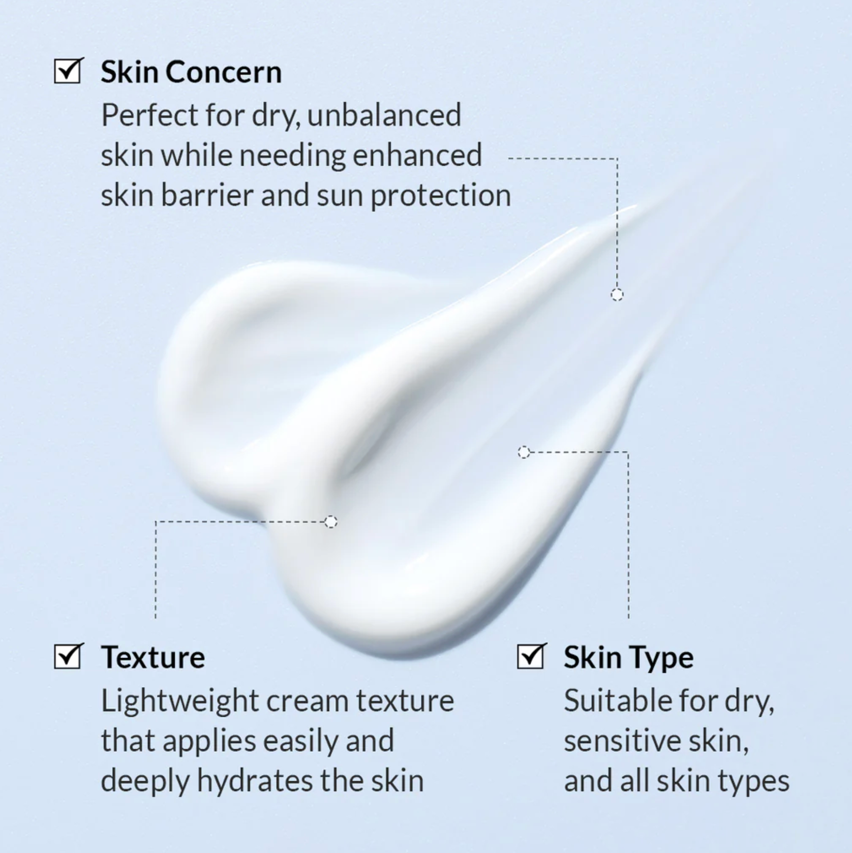 With its lightweight cream texture, it absorbs easily to provide deep hydration, making it ideal for dry, unbalanced skin in need of barrier repair and sun protection.